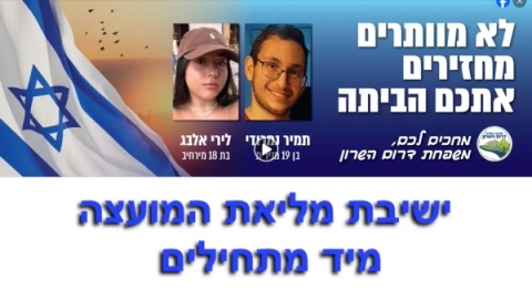מועצה אזורית דרום השרון על כל קהילותיה מתרגשת עם קבלת הבשורה על חזרתה הצפויה של לירי אלבג מירחיב הביתה אל משפחתה, יחד עם נעמה לוי, קרינה ארייב ודניאלה גלבוע.