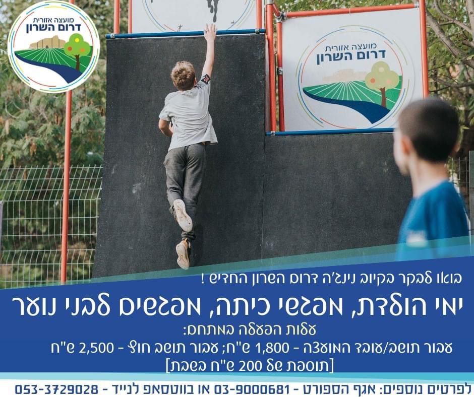 מתחם הנינג'ה המועצתי שמשמש את תלמידות ותלמידי דרום השרון, תושבים ואורחים שודרג בימים אלה. המתחם התחדש בקירות טיפוס חדשים, מתקנים חדשים לכל הגילים ופינות ישיבה מוצלות. ניתן לערוך בו ימי כיף, ימי הולדת, מפגשי כיתות, תנועות נוער ועוד. לתיאום פעילות ופרטים נוספים: 03-9000681