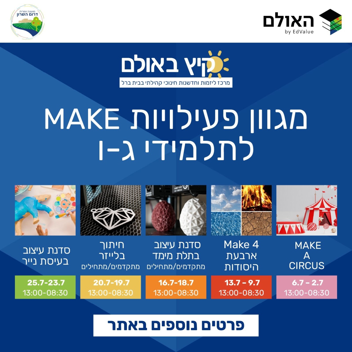 "האולם" מרכז היזמות והחדשנות בבית ברל מציע מגוון פעילויות מייקינג לקיץ לתלמידות ותלמידי כיתות ג'-ו'. עיצוב בתלת מימד, חיתוך בלייזר, יצירת קרקס בטכנולוגיות ידניות מתקדמות, עיצוב בעיסת נייר ועוד. להרשמה ופרטים נוספים לחץ כאן