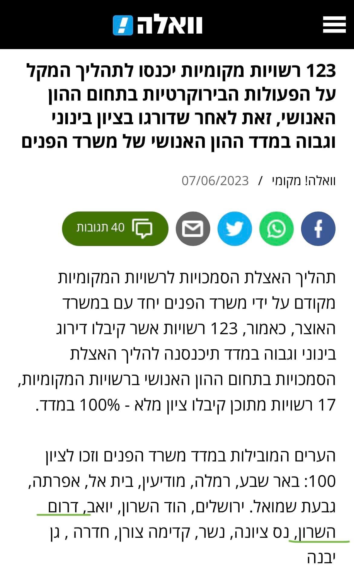 ציון 100 לדרום השרון בדירוג הרשויות המקדמות מינהל תקין של משרד הפנים
