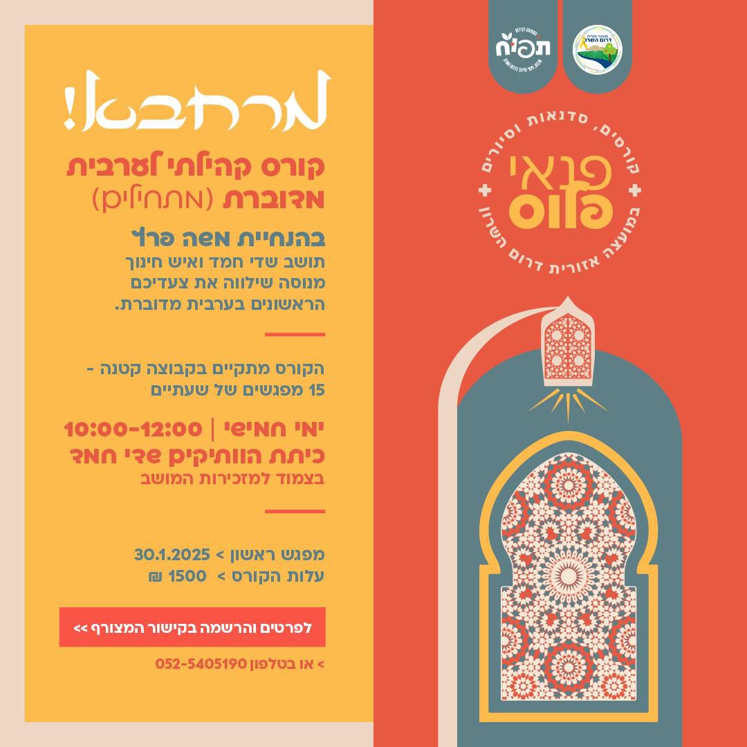 "מרחבא" קורס קהילתי לערבית מדוברת (מתחילים) יפתח בקרוב במסגרת סדרת "פנאי פלוס בדרום השרון" של עמותת תפו"ח. הקורס יתקיים בימי חמישי החל מ-30/1/20025 בשדי חמד. להרשמה: https://momoper.wixsite.com/spoken-arabic