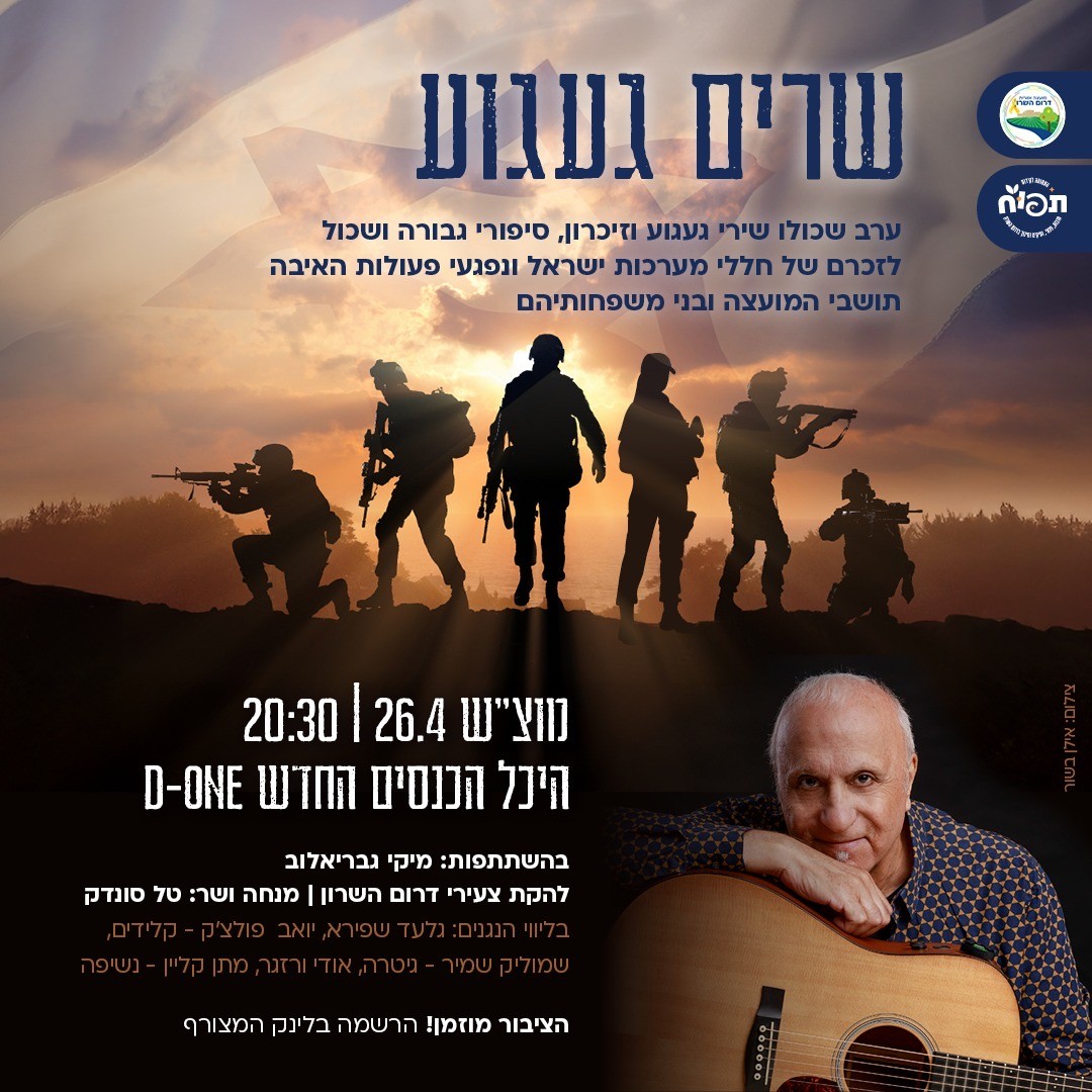 המועצה האזורית דרום השרון מזמינה אתכם.ן לערב שכולו שירי געגוע וזיכרון, וסיפורי גבורה ושכול לזכרם של תושבי ותושבות המועצה חללי מערכות ישראל ונפגעי פעולות האיבה ובני משפחותיהם.
